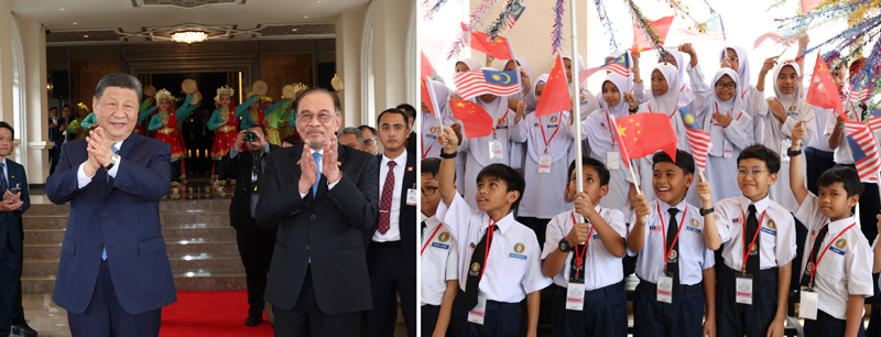 習(xí)近平乘車(chē)抵達(dá)總理官邸時(shí),安瓦爾熱情迎接。馬來(lái)西亞青少年揮舞兩國(guó)國(guó)旗,奏響歡快的鼓樂(lè),跳起熱情的民族舞蹈,熱烈歡迎遠(yuǎn)道而來(lái)的貴賓。