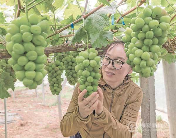 “今年俺種了10畝葡萄,有‘陽光玫瑰’‘藍寶石’‘浪漫紅顏’等數十個品種,采摘期從6月中旬能持續(xù)到9月中下旬。將所有品種放在一起算,一畝地大概能產3500斤葡萄?!编嵾M臉上露出“甜蜜”的笑容,2019年起,園區(qū)推行聯營模式,他便把家里的地流轉給村“兩委”領辦合作社,承包了22個棚種葡萄,不僅學會了先進的種植技術,還改善了家庭條件,生活越過越滋潤。